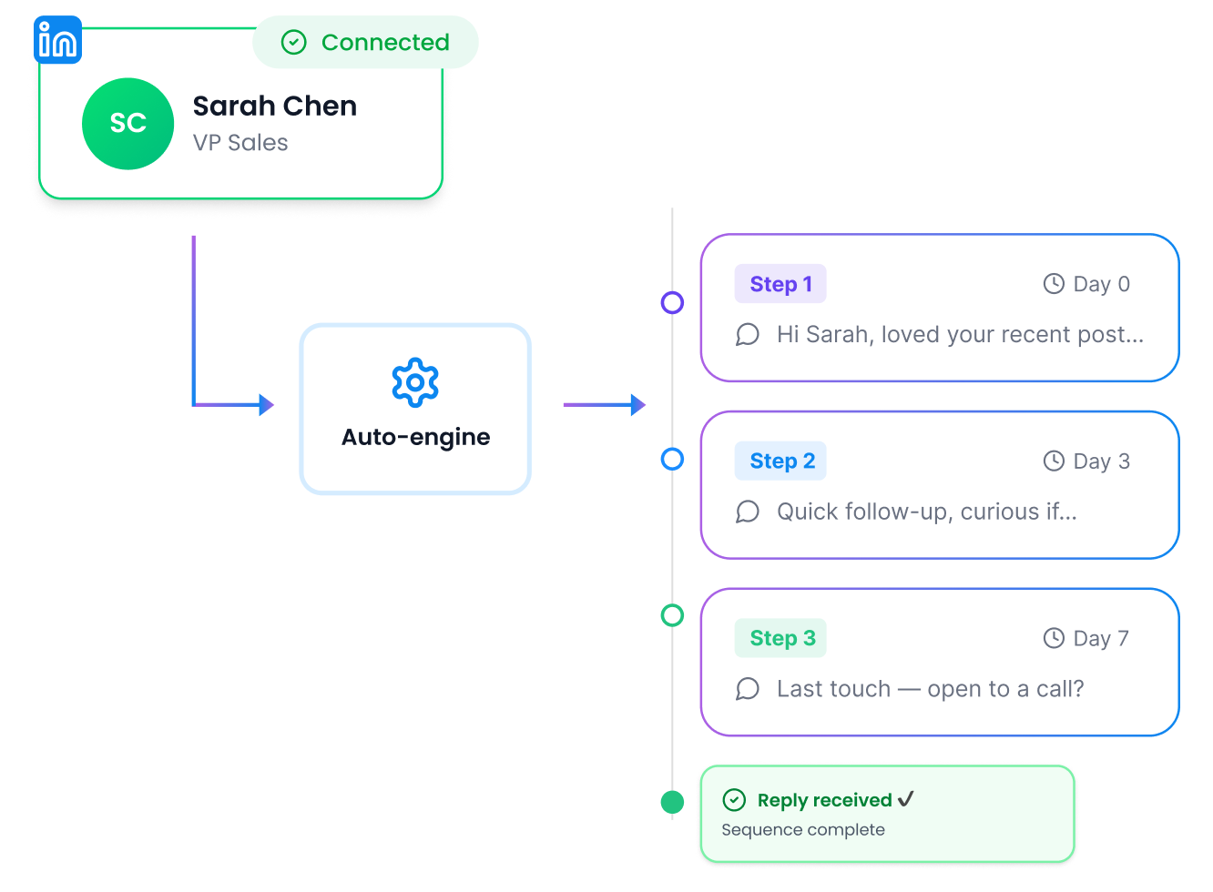 Yes. You can add profile visits, follows, and post engagement steps before your connection request goes out — so prospects recognize your name before you reach out.